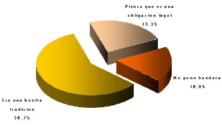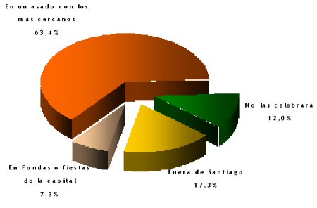 Parece un sueño patriótico hecho realidad: los santiaguinos va a celebrar las Fiestas Patrias con un asado, dicen que ponen la bandera porque creen que es una bonita tradición más que una obligación legal, prefieren la cueca a la cumbia y si hay que beber, quieren brindar, antes que nada, con vino. El tema se repite de año en año. Es como la pregunta de los regalos de Navidad, los sitios preferidos para el veraneo o en el terreno económico- las compras de los útiles y uniformes escolares. Y, de año en año, los chilenos vemos como las angustiosas profecías anticipadas se cumplen al pie de la letra: la cumbia desplaza a la cueca, el whisky al pisco y al vino. Los tradicionalistas acumulan más quejas: nadie pone la bandera y si la ponen lo hacen porque los obliga la ley. Pocos celebran como se debe, ya que parten de viaje, si es posible al extranjero. Sin embargo, esta larga enumeración de mitos no corresponde exactamente a la realidad, según una encuesta de especialistas de la Universidad Diego Portales. Sólo las fondas y las ramadas, cuya historia se remonta a los primeros tiempos de la república, parecen pasadas de moda. En vez de ir a zapatear la cueca en los espacios dispuestos para la ocasión por los municipios, los santiaguinos optan mayoritariamente por un asado con la familia y los amigos. Una minoría se irá fuera de Santiago y un porcentaje aun menor dice que no celebrará las Fiestas Patrias, seguido por quienes sí cumplen con la tradición de visitar fondas y ramadas. Nadie se pronuncia, porque no se le preguntó, por lo obvio, por las expectativas climáticas. Todos esperamos que haya buen tiempo. En un año cargados de agua de norte a sur y de temporales violentos en todas las regiones, incluyendo Santiago, el gran deseo patriótico es que la fiesta no se nos vaya a aguar. Aunque nunca faltan los disidentes, lo más probable que esta interrogante tendría una amplísima respuesta a favor. En cuanto a lo que sí se preguntó, el siguiente es el detalle:
